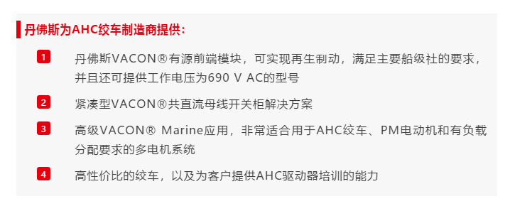 丹佛斯坚持以正确态度做事,致力于为客户提供满足严苛要求的正确产品。公司位于挪威 Holmestrand,为多家主要的电动AHC绞车制造商供应交流驱动系统,具有良好的业绩记录。