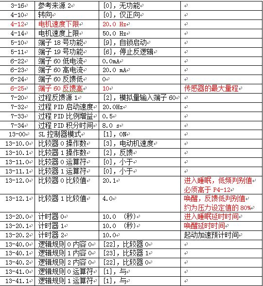 通过以上设置,当恒压系统中泵的转速低于20.1 Hz时,延时10秒,启动休眠模式,变频器停止输出;在泵处在休眠状态时,当恒压供水系统的压力反馈值低于4 bar时,延时10秒,启动变频器,这样就实现了恒压供水系统的休眠功能。