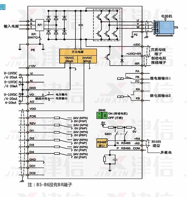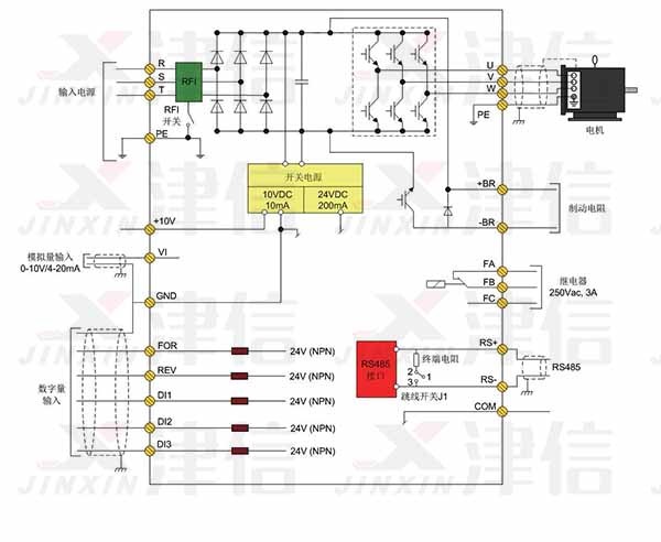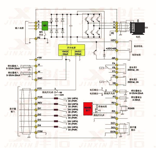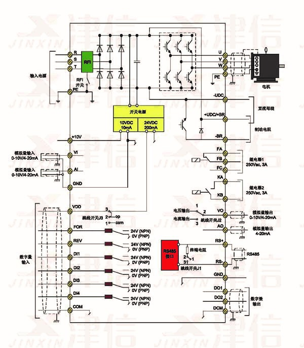 海利普变频器主要由整流、滤波、逆变、驱动单元、制动单元、检测单元微处理单元等组成。采用交-直-交工作原理,首先将三相交流电经整流模块变换成直流,再进行滤波后,通过IGBT等其它电力电子器件逆变成频率和电压均可变的三相交流电供电机使用。同时,通过IGBT的开断调整输出电源的频率和电压,从而达到调速、节能的作用。以下是海利普各系列变频器的接线示意图。