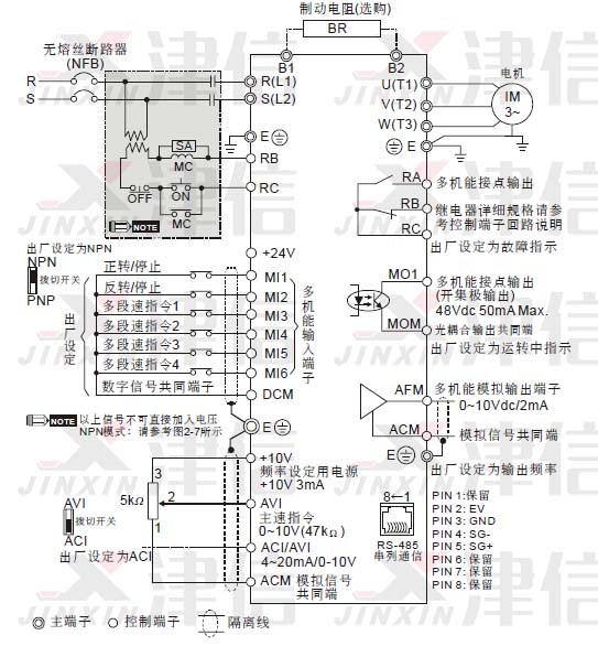 l 为了安全和减少噪声,230V 系列采用第三种接地(E ),460V 系列采用特种