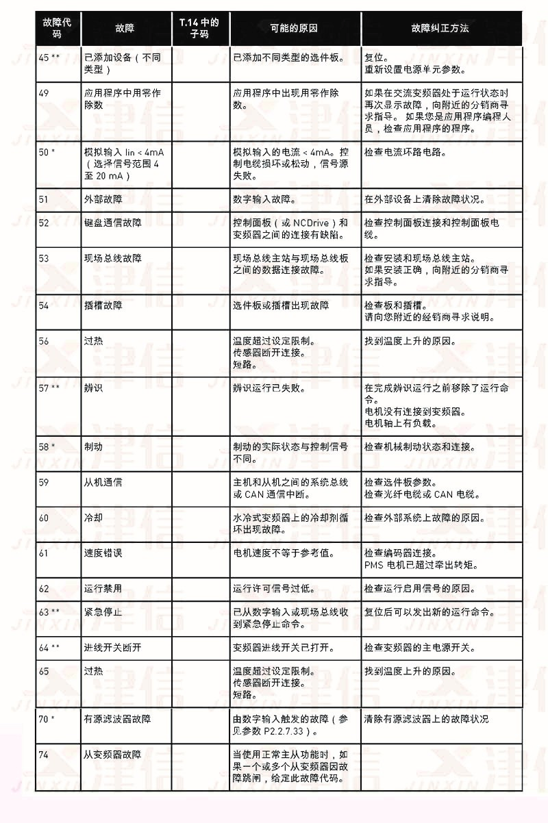五、伟肯NX变频器故障代码FT45,49,50,51,52,53,54,55,56,57,58,59,60,61,62,63,64,65,70,74