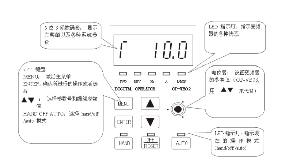 海利普变频器的参数通过面板来进行设置。面板和使用步骤如下图: