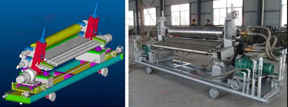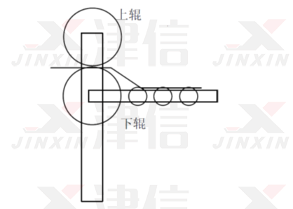 如图中所示:设备采用了上下两个压辊,玻璃从两个压辊中间经过,完成压延。在压延过程中两个辊需要同步,使玻璃平滑。