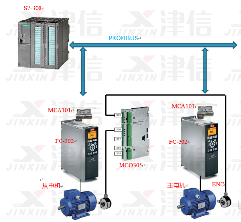 PLC与丹佛斯FC302变频器之间进行PROFIBUS通讯,通过PLC可以设置同步功能、非同步功能、等工艺参数;FC302变频器控制从机电机,以保证出标精度及响应精度。 变频器通过MCO305运动控制卡,实现角度同步控制。MCO305运动控制卡内要编程,接收现场总线控制命令,发送各种状态信号,实现各种控制,如单机运行/同步运行模式切换,判断从机编码器故障等。