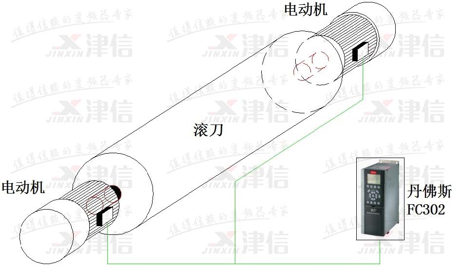 丹佛斯FC302变频器通过磁通矢量控制同时驱动两台异步伺服电机,保证在飞剪同步的过程中滚刀两电机输出转速和转矩一致。在选型和调试时只要将电机的功率和电机的电流相加即可,这样就可以只通过丹佛斯FC302变频器来实现刚性连接的两个电机同步。