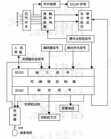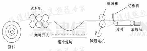 按上述工艺数据要求对这类控制系统进行设计并不困难,但由于传统解决方案存在的缺陷,往往留下诸多遗憾。如对低端设备而言,传统实现方法一般采用直流调速系统,实施方案的缺点是:系统笨重、耗电量大、调试复杂、维护成本高;在定位控制方式方面,一般采用读取行程开关信号后通过预减速配合气压制动的定位方式, 剪切效率很低, 误差较大。而对高端设备,一般采用直流伺服技术,虽然精度和效率得以保证,但价格非常昂贵,产品性能价格比难以令人满意。
