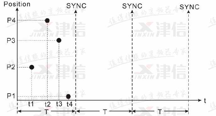 10MC 接有四台伺服驱动器,T 为同步周期。在同步周期内,四台伺服驱动器分别在不同的时刻(t1、t2、t3、t4)接受到控制数据,但是控制数据并没有生效。当伺服驱动器接收到同步信号(SYNC),控制数据同时生效。