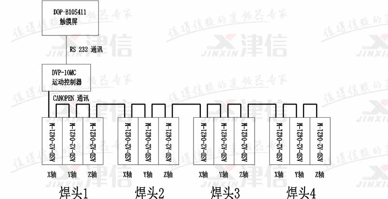本方案针对多焊点塑料焊接设计。整套设备都由10MC控制,每个焊头由3套A2伺服驱动器组合完成,实现空间上的X-Y-Z 3轴动作。,可以单焊头或多焊头组合,并且按照配方所规划的路径运动。