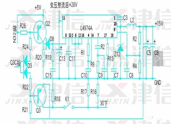 Ø  测试芯片L4974A 输出电压15V为0V,查芯片8脚软启动电压是0.5V,正常值为3.85V,所以芯片L4974A的8脚输入电压不对。经查Q2输入触发电压正常。
