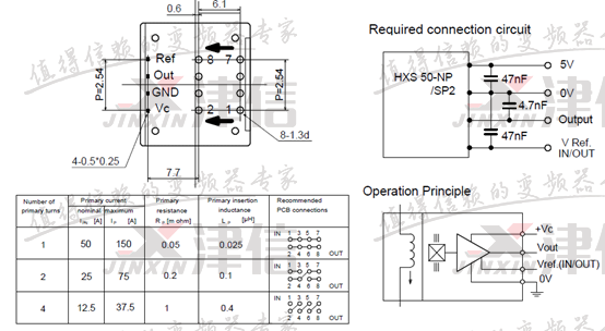 3、测量三相输出电流检测电路,查看电流传感器型号为HXS 50-NP,测量输入电源只有2.4V,而HXS 50-NP正常工作的输入电源为5V。可以确定故障点在此。接线图如下: