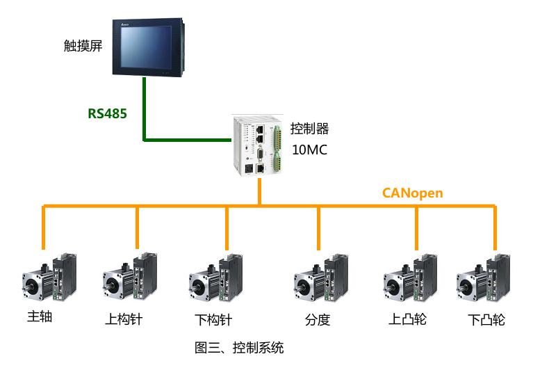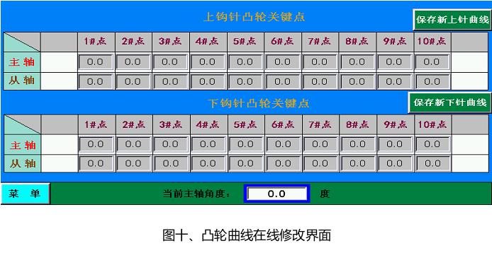 10MC总线运动控制器控制主轴运行,主轴带动机械凸轮控制钩针的前后运动,同时主轴又作为钩针、上下电子凸轮的主轴信号,控制钩针伺服、上下凸轮伺服根据预设的凸轮数据运动。