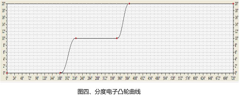 设备通过分度伺服跟随主轴执行预先设定的电子凸轮数据,从而达到对定子的分度控制。分度电子凸轮曲线如图四所示。