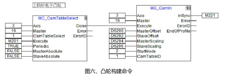 首先构建好凸轮曲线,使用“MC_CamTableSelect”指令选择对应的凸轮曲线;再通过“MC_Camin”指令使得主轴与从轴按照选定的凸轮曲线啮合(如图六所示)。构建完成的钩针角度电子凸轮曲线如图七所示,构建完成的钩针上下电子凸轮曲线如图八所示,
