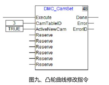 在实际使用中,因客户产品的多样性,不同的马达定子,客户需要随时修改电子凸轮曲线,通过10MC运动控制器的“DMC_CamSet”指令可以在线实时修改电子凸轮曲线,提高了设备的通用性。凸轮曲线修改指令如图九所示,在线修改凸轮曲线界面如图十所示。