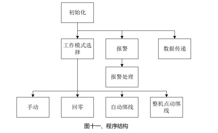 初始化程序负责在控制器送电开机后,对运动控制器的通讯端口、I/0端口以及程序进行初始化操作;然后起动后台报警程序,用于监控机器的故障状态,当设备发故障后,根据故障的等级,令设备执行急停、暂停、警告等相对应的处理;然后进入回零模式,找到各轴的零位,并令各轴进入工作起始位置;只有等回零模式完成以后,设备才能进入自动工作模式;最后程序根据客户选择的工作模式,在得到起动命令以后,正式开始运行。一台定子绑扎完毕以后,定子被自动送出,这时程序回到前面状态,等待新的起点命令。如此周而复始。