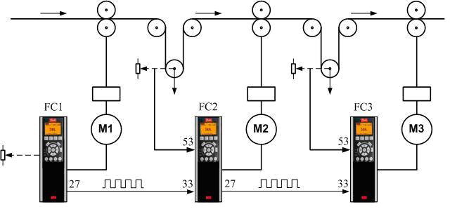 FC1工作在开环状态。其速度输出送往后段作为扩展PID控制的前馈输入,可采用脉冲方式或模拟量方式。后段变频器同时要引入此驱动器前侧的跳舞轮处电位器反馈信号。理想状态是在跳舞轮处于最佳位置时,电位器位于5V位置。