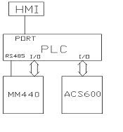 两台变频器的起动/停止,故障报警全部通过数字I/O点控制;收卷跳舞轮位置控制由ACS600独立完成;主机转速由S7-200 PLC通过RS485串行通讯口给定。