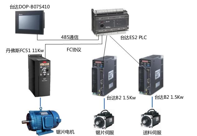 台达ES2 PLC自带两组高速脉冲用于控制伺服,最高频率到达100KHz,同时满足了精度和速度的要求。ES2 PLC带有两组RS485通信口,分别与DOP-B07S410触摸屏和FC51变频器通信。