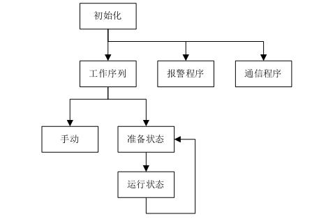 开机后,首先进行通信和状态的初始化。初始化完成后同时调用工作序列、报警和通信子程序。工作序列中,包含手动和自动两种状态,自动运行又包括单次锯切和连续锯切两种工作模式。报警程序用于对机器状态进行实时监控,并根据故障情况执行相关动作。通信程序用于PLC和变频器的FC协议通信,实现运行状态和报警信息的监控。