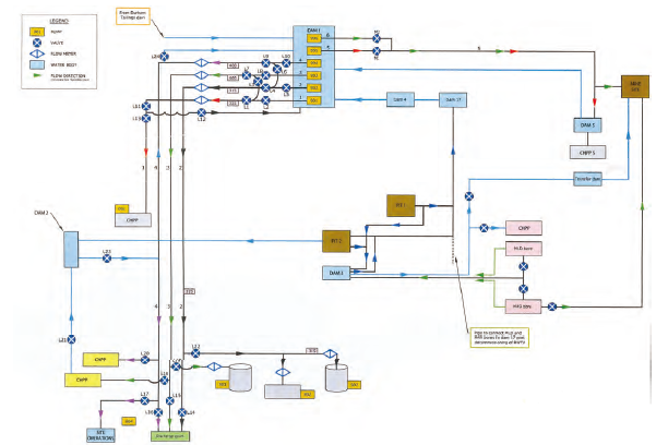 某露天矿场需要考虑三处大型设施中的水资源集中管理和水资源重复利用问题,经过选型和估算,决定建立一个可处理二百万立方米的水处理设施。示意图如下: