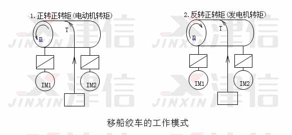 移船绞车是重要的海工设备,在海上工作平台、铺管船里有广泛的应用。移船绞车的工况与起升相似,正转时收线,变频器工作于电动机模式,电机对负载作功;反转时放线,变频器工作于发电机机模式,负载对电机做功,要求变频器内置制动晶体管。与普通起升不同的是,移船绞车连续工作时间很长(数小时),所以对于变频器的过载能力要求不高,但是要求变频器具有100%制动转矩连续运行的能力。