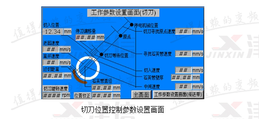 石英切割机有三个控制部分构成:切刀旋转控制、切刀位置控制和送料位置控制。切刀旋转控制只要速度可调即可;切刀位置控制需要在切割石英管或石英棒的过程中控制其位置和不同段内的速度,首先要保证切割产品的刀口质量,同时要提高生产效率;送料位置控制需要每次往前送设定长度的石英管或石英棒,精度要求0.2毫米。